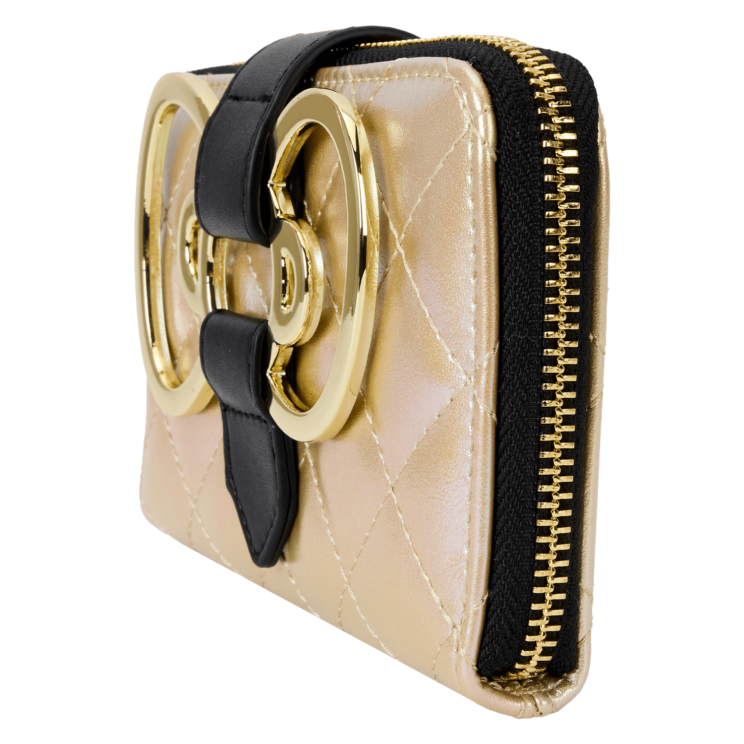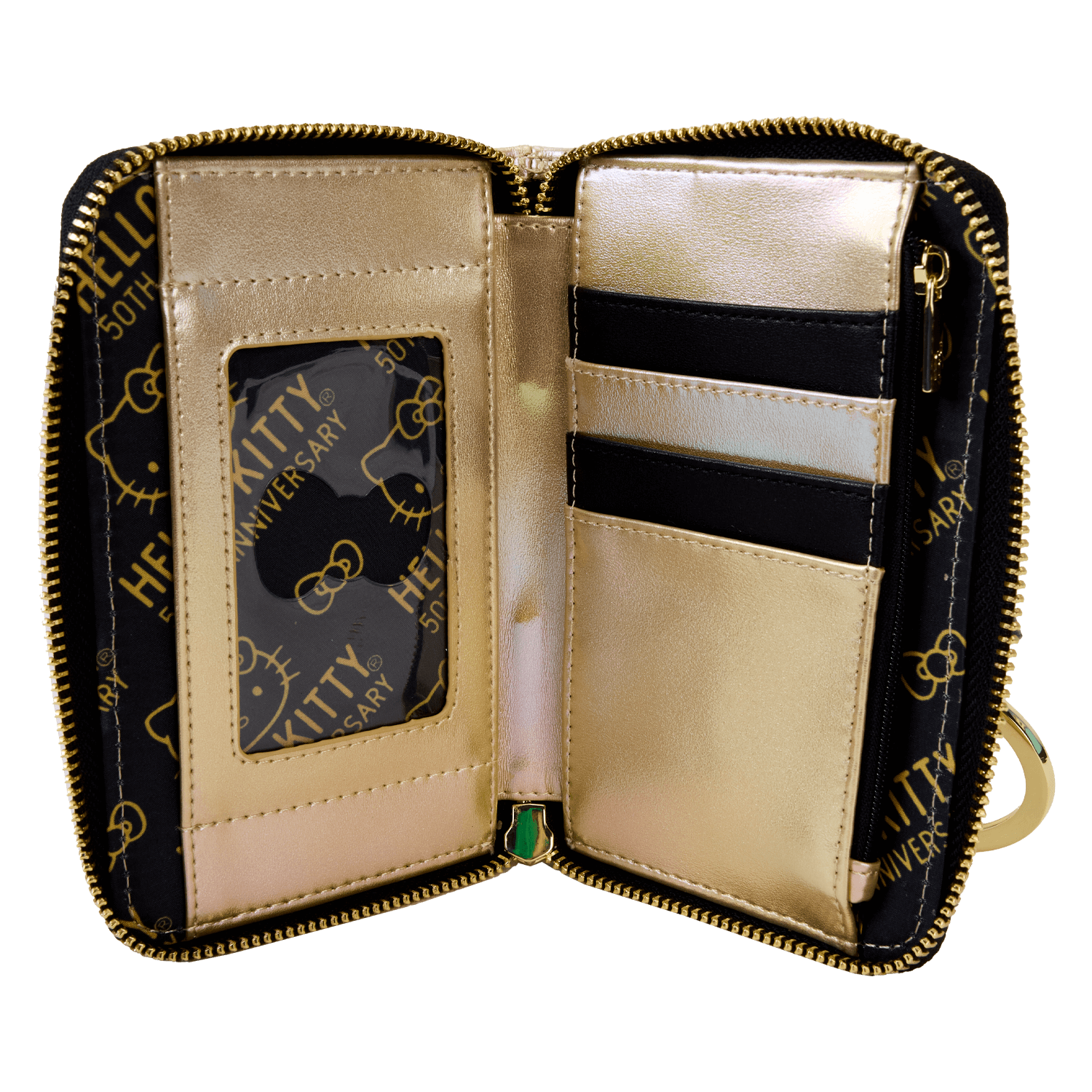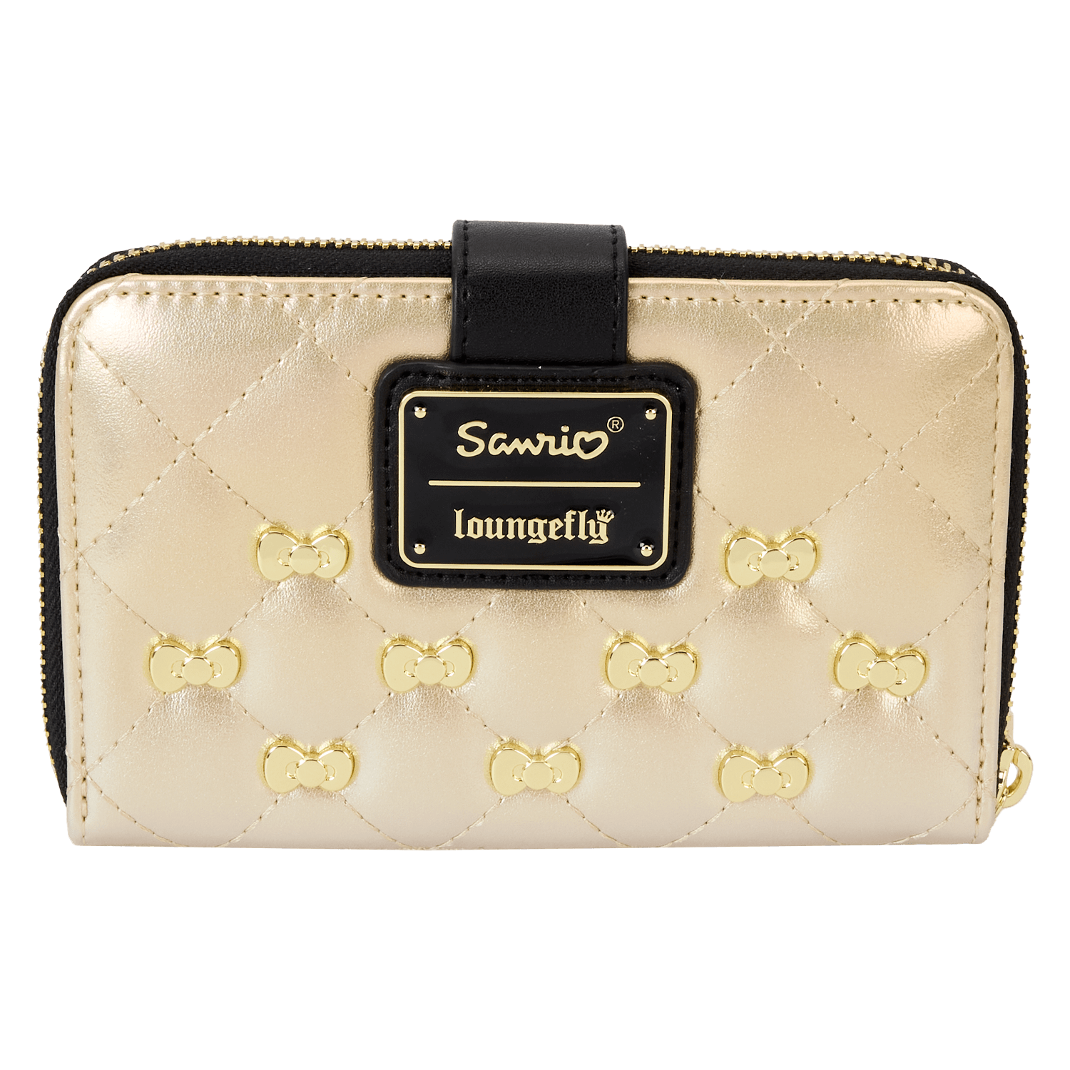 This pop icon is celebrating 50 years of timeless style! Look to the future with Hello Kitty as she commemorates her golden anniversary. With a metallic quilted design, a molded metal charm, and bow-shaped rivets, this wallet makes an elevated statement piece for any outing.