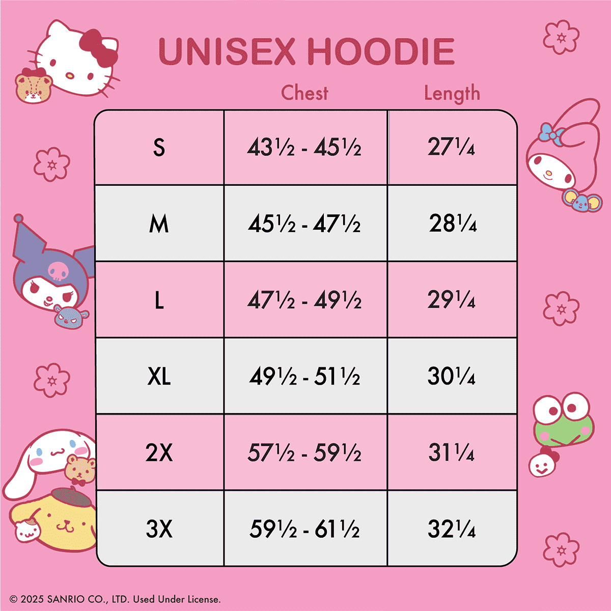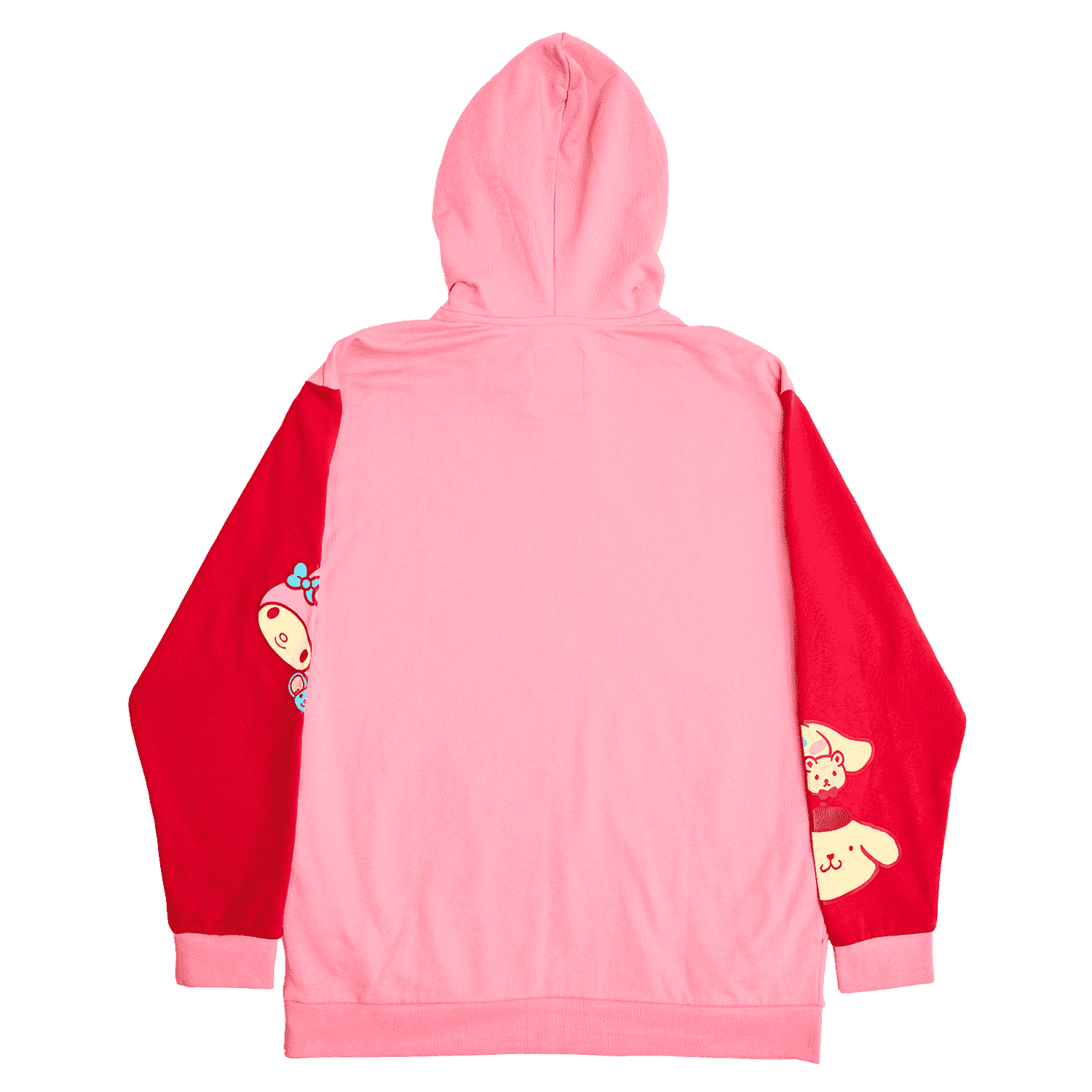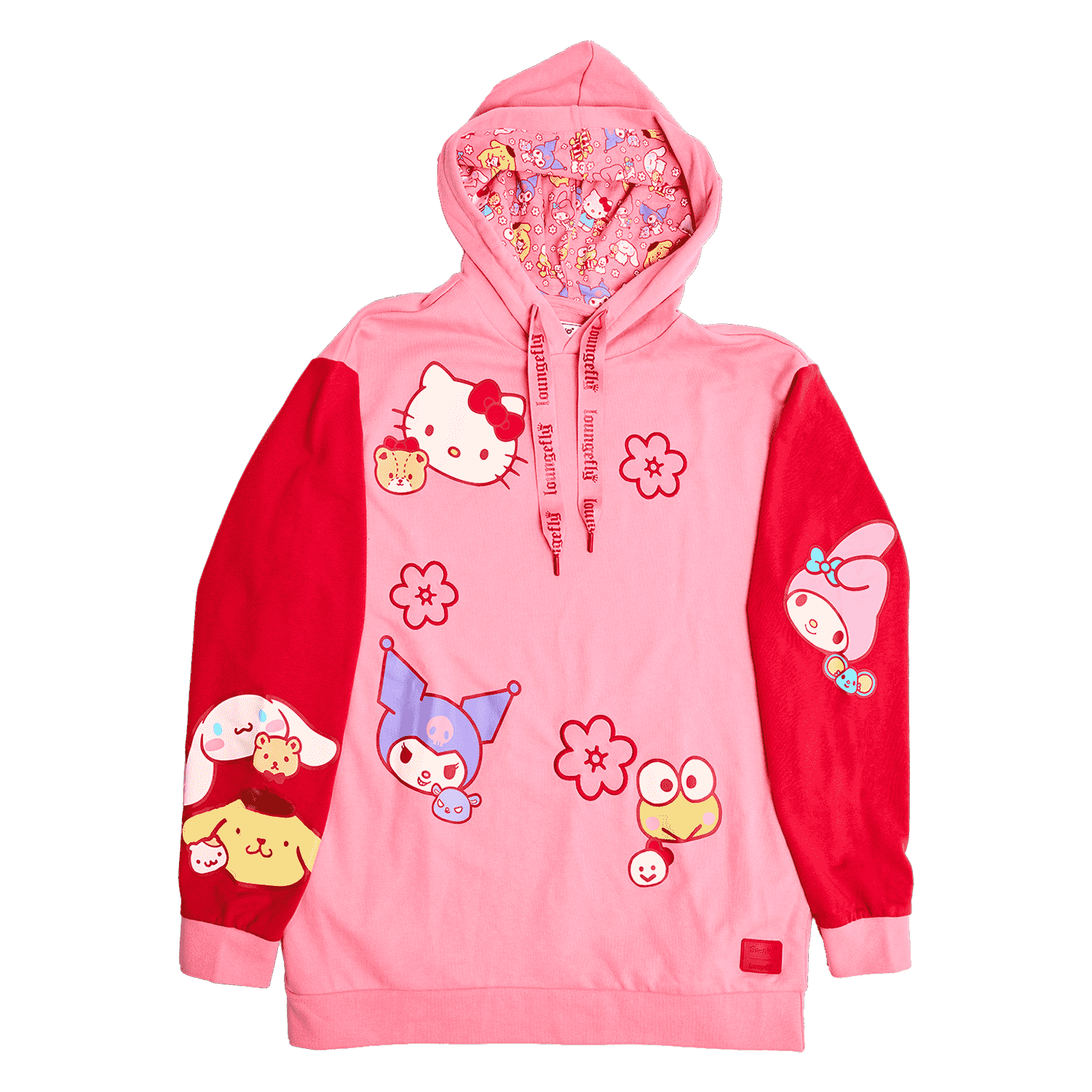 Hello, sweet blossoms! Stop and smell the flowers in style with this Hello Kitty? and Friends hoodie, featuring a sprinkle of embroidered blooms. Sanrio fans, you¡¯ll find adorable prints of fan-favorite characters and their buddies. Hello Kitty and Tiny Chum appear on the front, along with Keroppi with Teru Teru (Ruby), and Kuromi with Baku. The sleeves are screen-printed, and on them you¡¯ll spot My Melody with Flat on one sleeve, and Cinnamoroll with Bear and Pompompurin with Muffin on the other. Color-blocking in pink and red adds a brilliant touch. Stay cozy as you gather your friends for fun adventures and share smiles wherever you go.