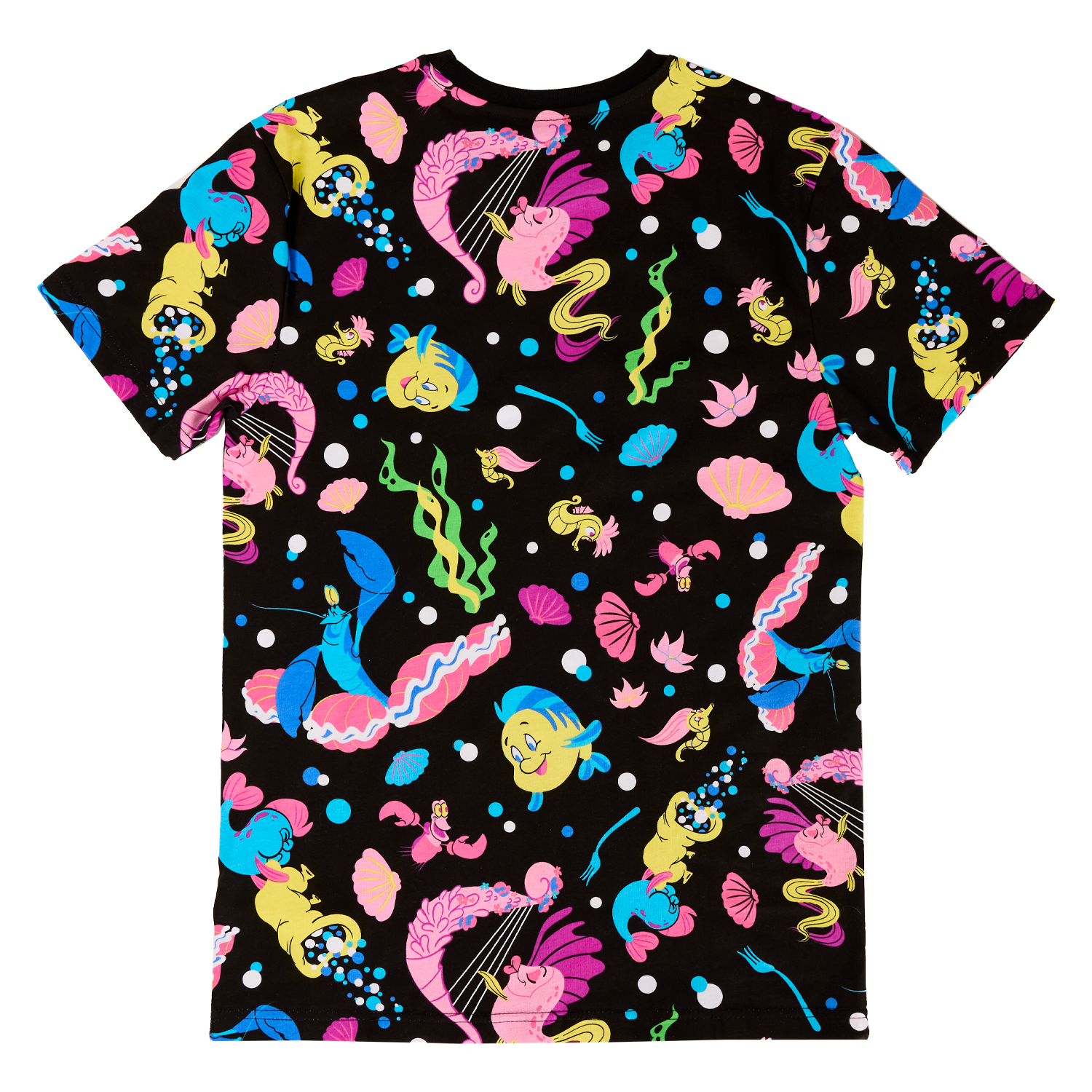 When an underwater band begins to play, dress for the occasion¡ªdon¡¯t delay! Our Loungefly Disney The Little Mermaid 35th Anniversary ¡°Life is the Bubbles¡± Unisex tee is ready for a celebration. This comfy and stylish tee shirt incorporates an all-over pattern of the ¡°Under the Sea¡± moment, where Disney¡¯s Sebastian takes center stage. The black background makes the colors and original artwork pop. In the pattern, you might see Disney¡¯s Ariel seated on a rock under the sea, Sebastian singing, delightful seahorses, a carp with a harp, bass with brass, Flounder, aquatic plants, a blue crustacean playing pink clamshell drums, and bubbles. This short-sleeved, crewneck shirt pairs well with a variety of pieces¡ªor stands out on its own as a cool and comfortable option. Swim away with something fun to celebrate The Little Mermaid¡¯s 35th anniversary.