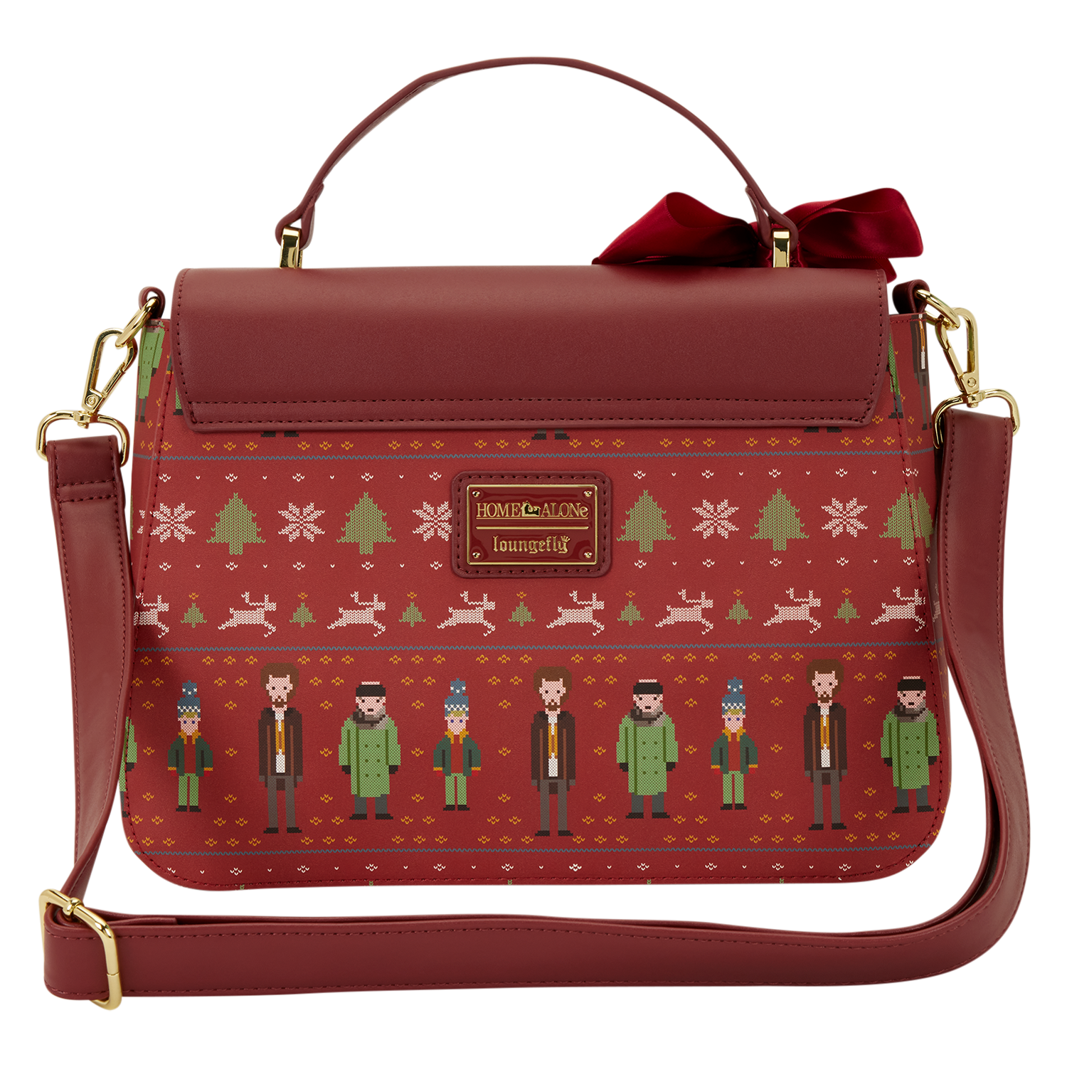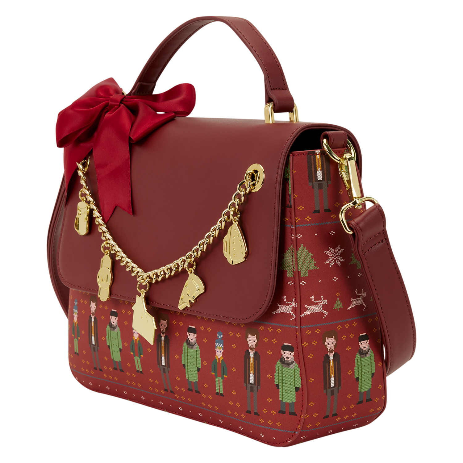 The body of this crossbody bag features images of Kevin, Harry, and Marv amongst other seasonal designs inspired by a holiday sweater. The top flap features metal charms of various items from the movie, like the McCallister home, pizza, and an iron! A 3D bow attached to the top handle brings the look together.