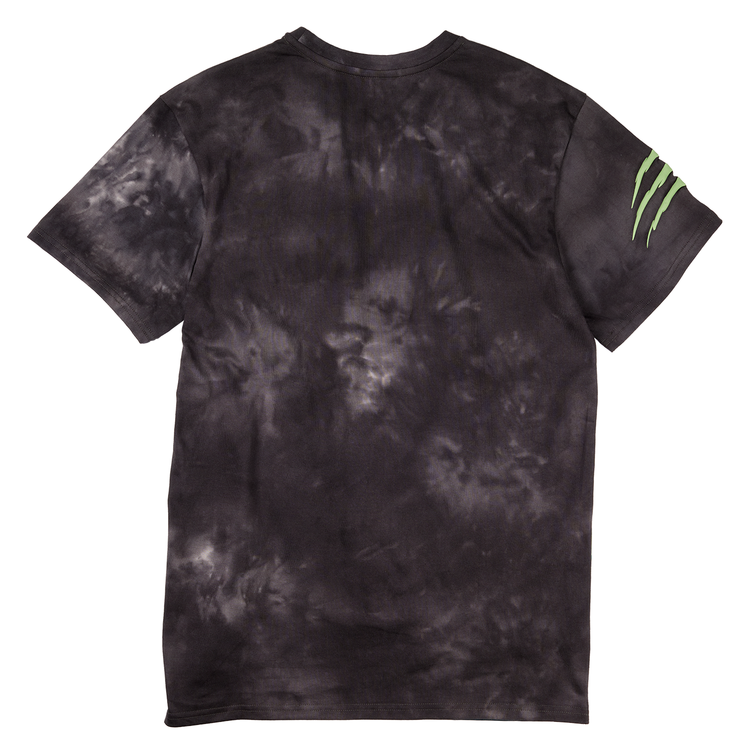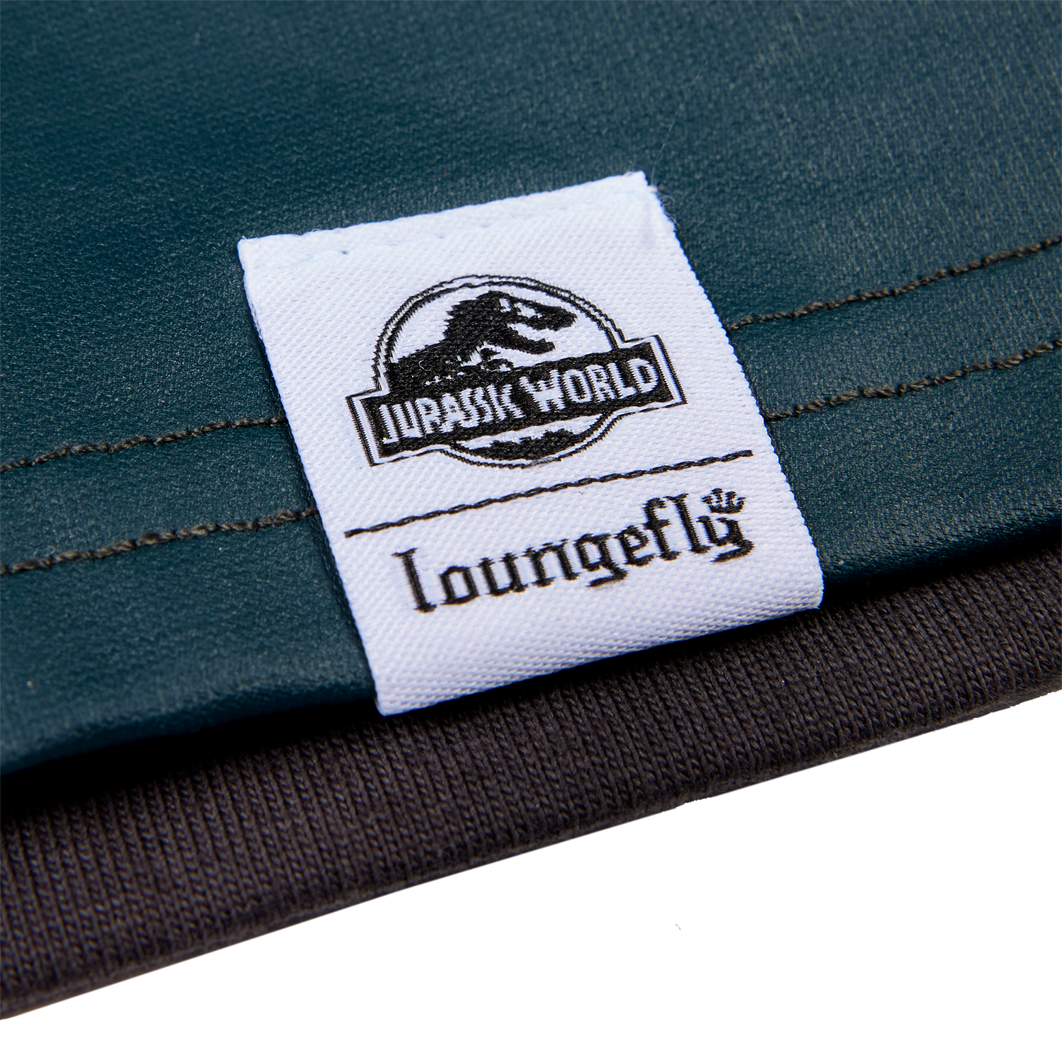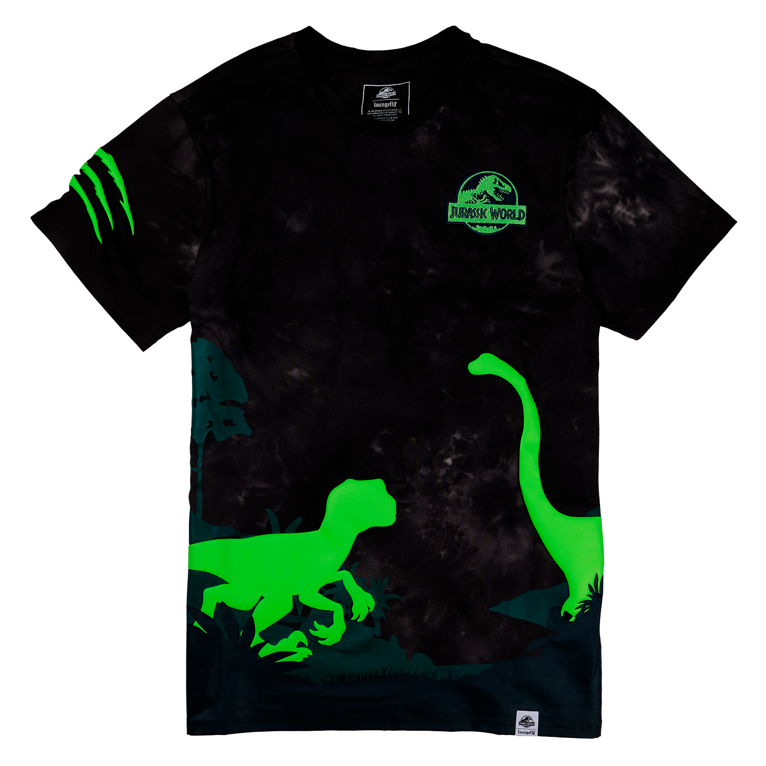 Find the Jurassic World logo embroidered on the upper right corner. A jungle scene unfolds below, some dinosaurs peeking out amongst the foliage in puff print. You’ll also find a claw mark over one sleeve.