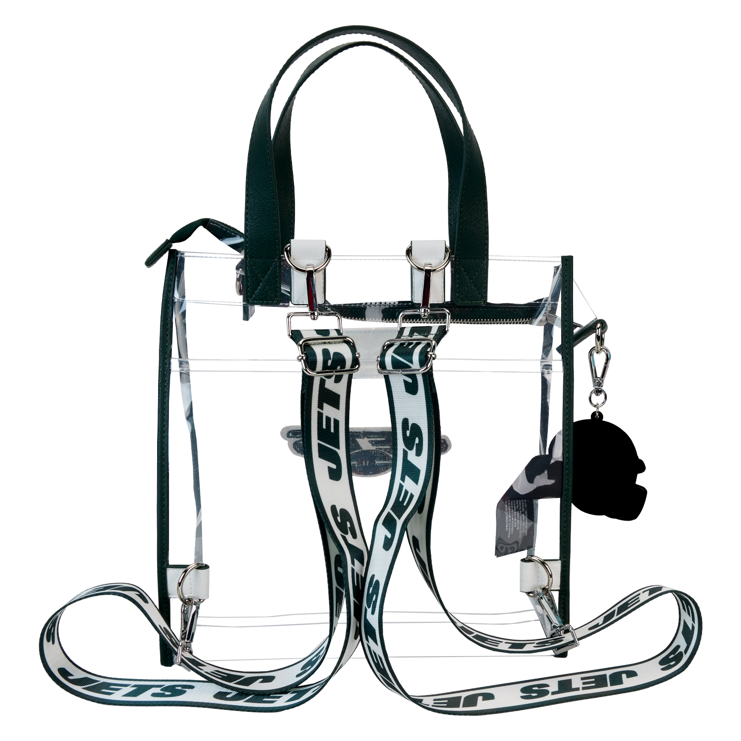 Feeling game-day ready? Cheer on your favorite football team with this convertible tote bag! The clear design makes it easy to bring your belongings into the stadium, and versatile shoulder straps help to keep your bag close as you wander the crowds. A chenille patch of the Jets logo, a helmet-shaped bag charm, and coordinating team colors give this bag an elevated look. No need to sacrifice your style at the big game ¨C this accessory is the perfect combination of fashion and function.