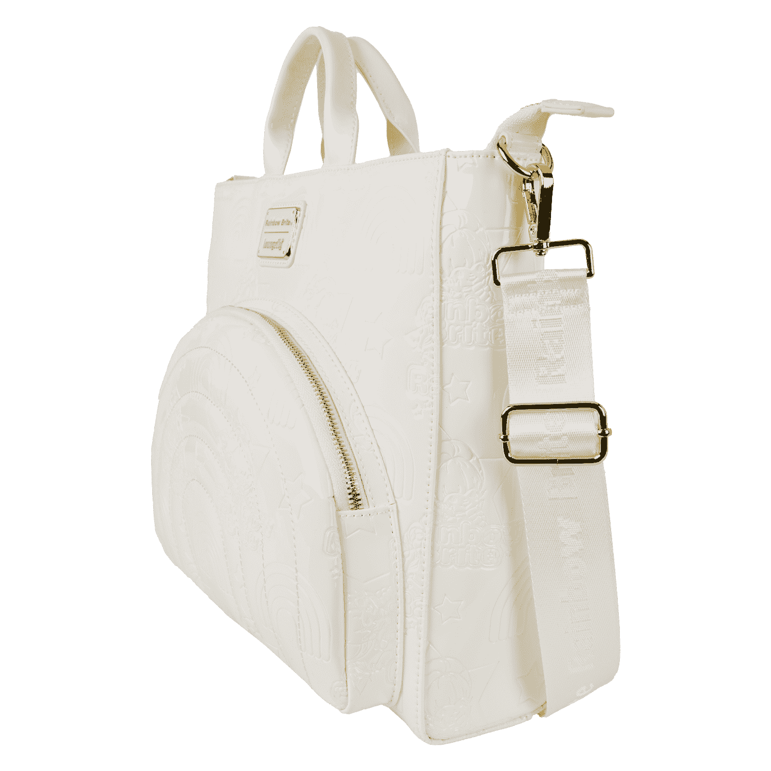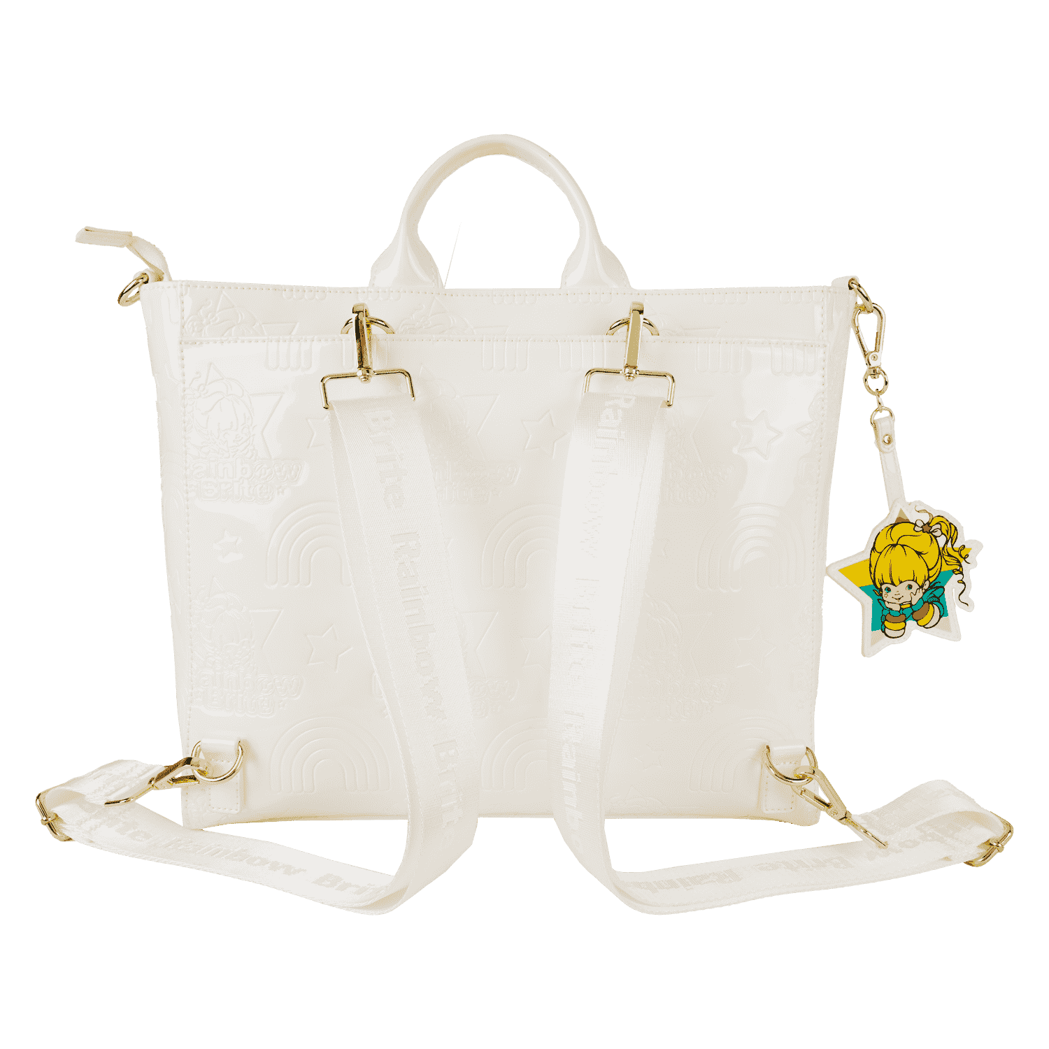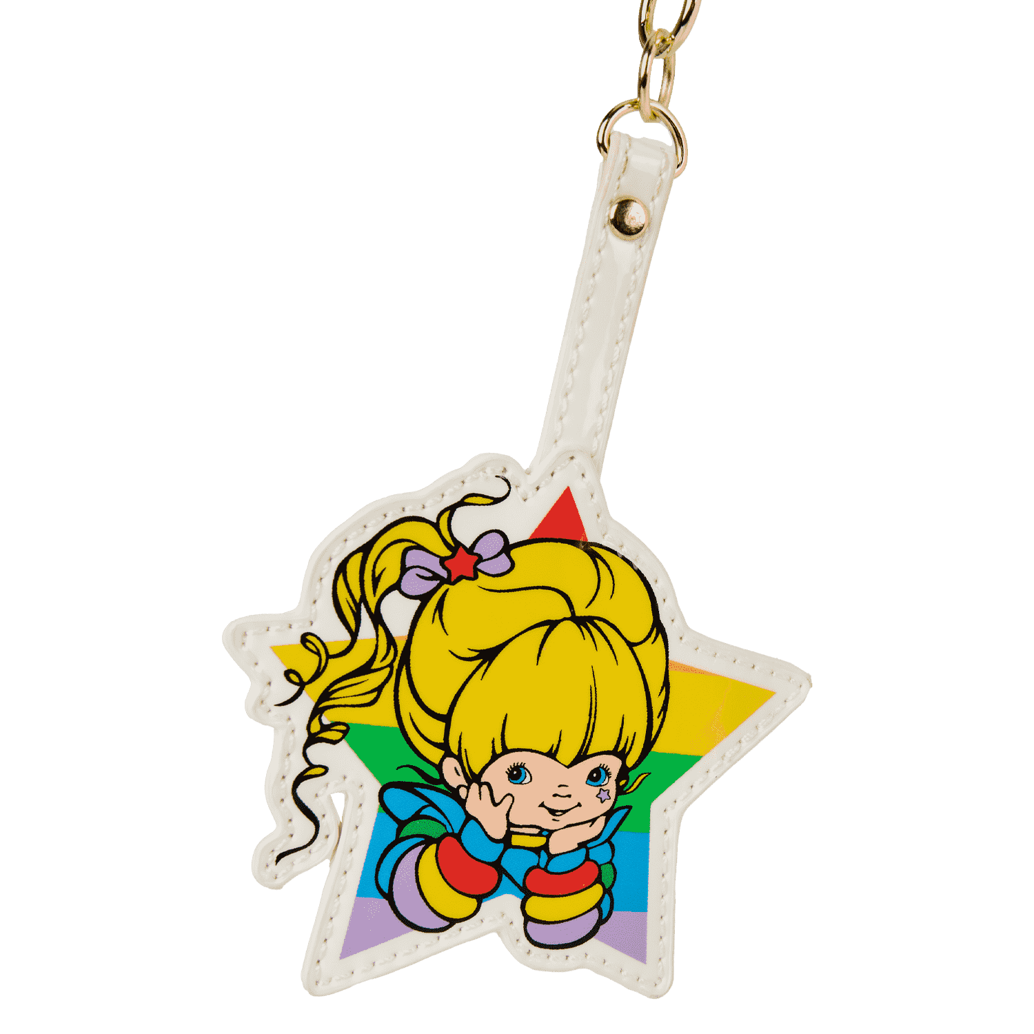 All over, you’ll find debossed images of the Rainbow Brite logo, rainbows, and stars. The front features a padded applique of a rainbow. You’ll also find a faux leather charm of Rainbow Brite attached!