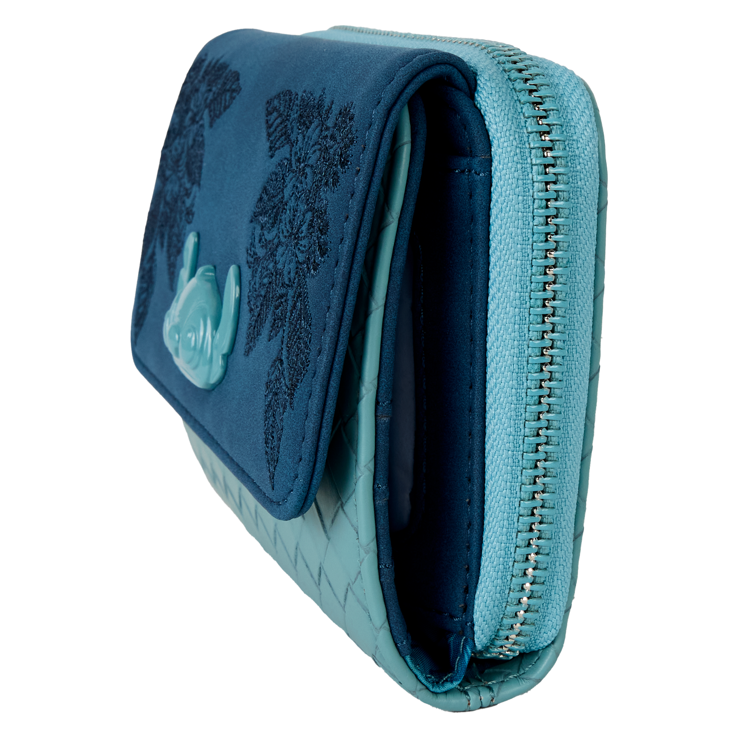 This wallet features a molded metal charm of Stitch on the front with embroidered floral details around him. Inside, you’ll find plenty of slots to hold your cards and cash, AND the clear ID slot has Stitch’s silhouette cut out of it! It’s TOO CUTE!