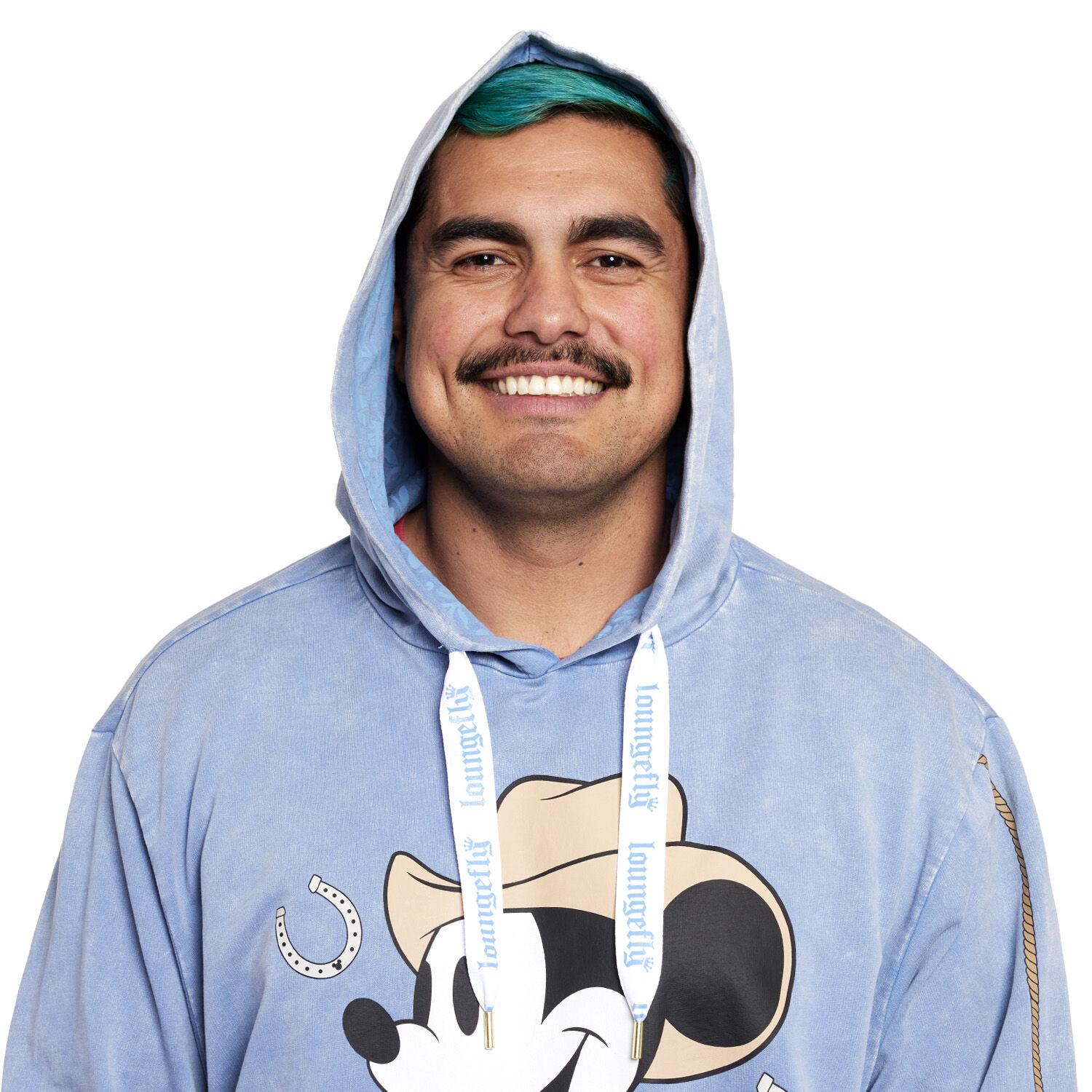 The Loungefly Western Mickey Unisex Hoodie is made of French Terry cotton (60% cotton, 40% polyester). Extra-large lanyard-style drawcords add versatility in wear and fit and are perfect for displaying your favorite pins. Cuffs and waistband are 95% cotton and 5% Spandex.